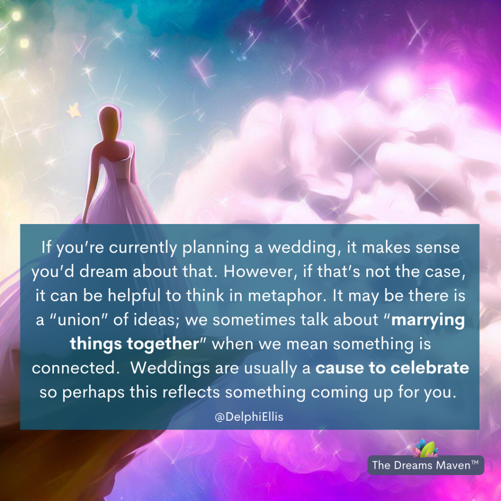 If you are in the process of planning a wedding or have been thinking about, or even hoping to get married, it makes sense you’d have this dream. The stress of planning a wedding would also come through as dream content, as would a desire to marry the “person of your dreams“. This can be a literal reflection of those desires or a metaphor being given whilst you’re asleep.